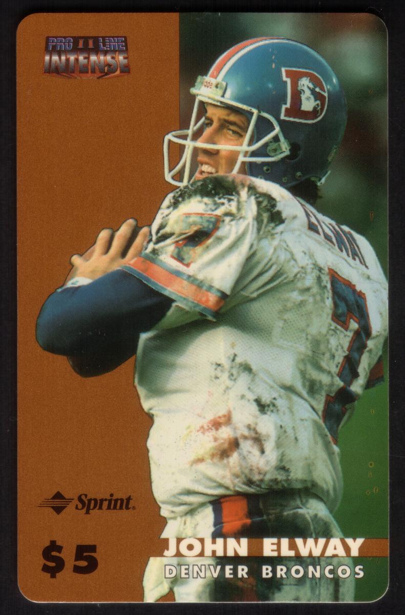 This collectible card features John Elway, the former NFL quarterback for the Denver Broncos. The card is from the 1997 Proline Intense series and is numbered 9 out of a limited run of 20. John Elway is pictured in his Denver Broncos uniform, with his name and team prominently displayed. The card’s value is indicated as $5.