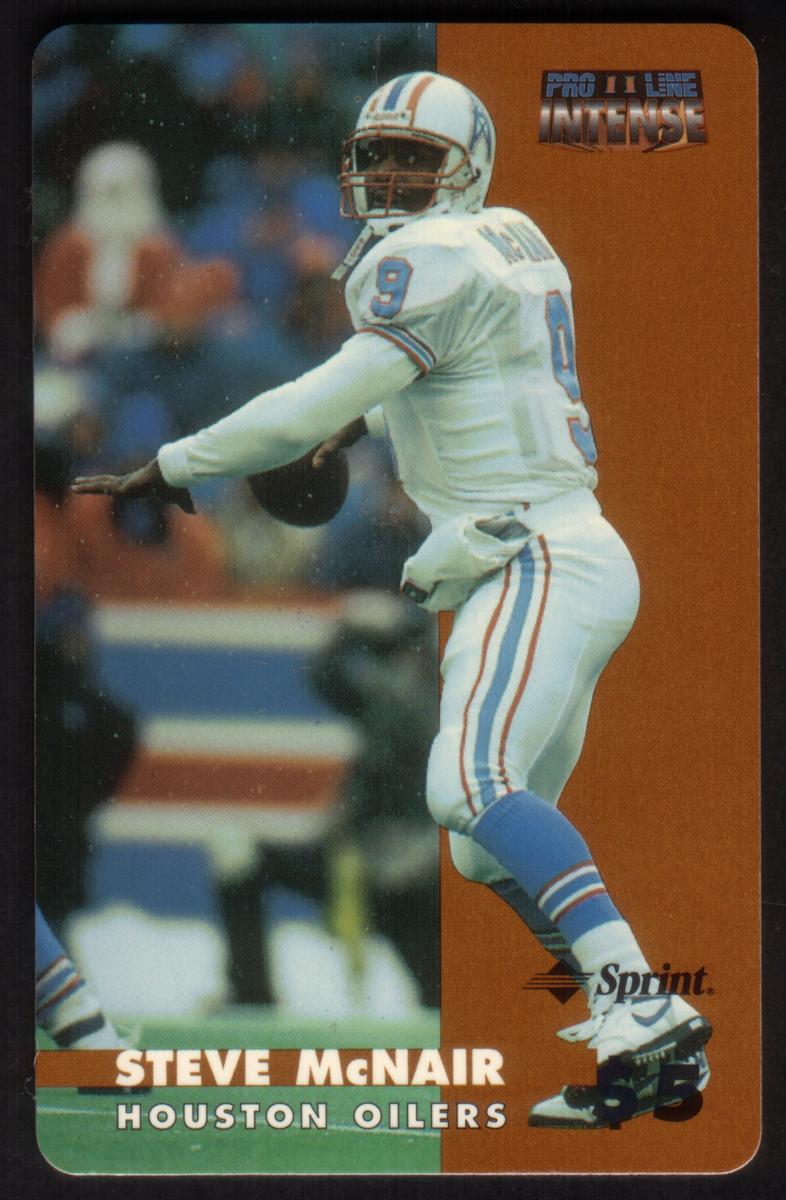 This collectible card features Steve McNair, an NFL football player for the Houston Oilers. It shows McNair wearing his Houston Oilers uniform, including a helmet, with the number 11 clearly visible on his jersey. McNair is depicted in an action pose, holding a football as if preparing to throw a pass. The background is predominantly a mix of dark and vibrant colors, emphasizing the player in the foreground.