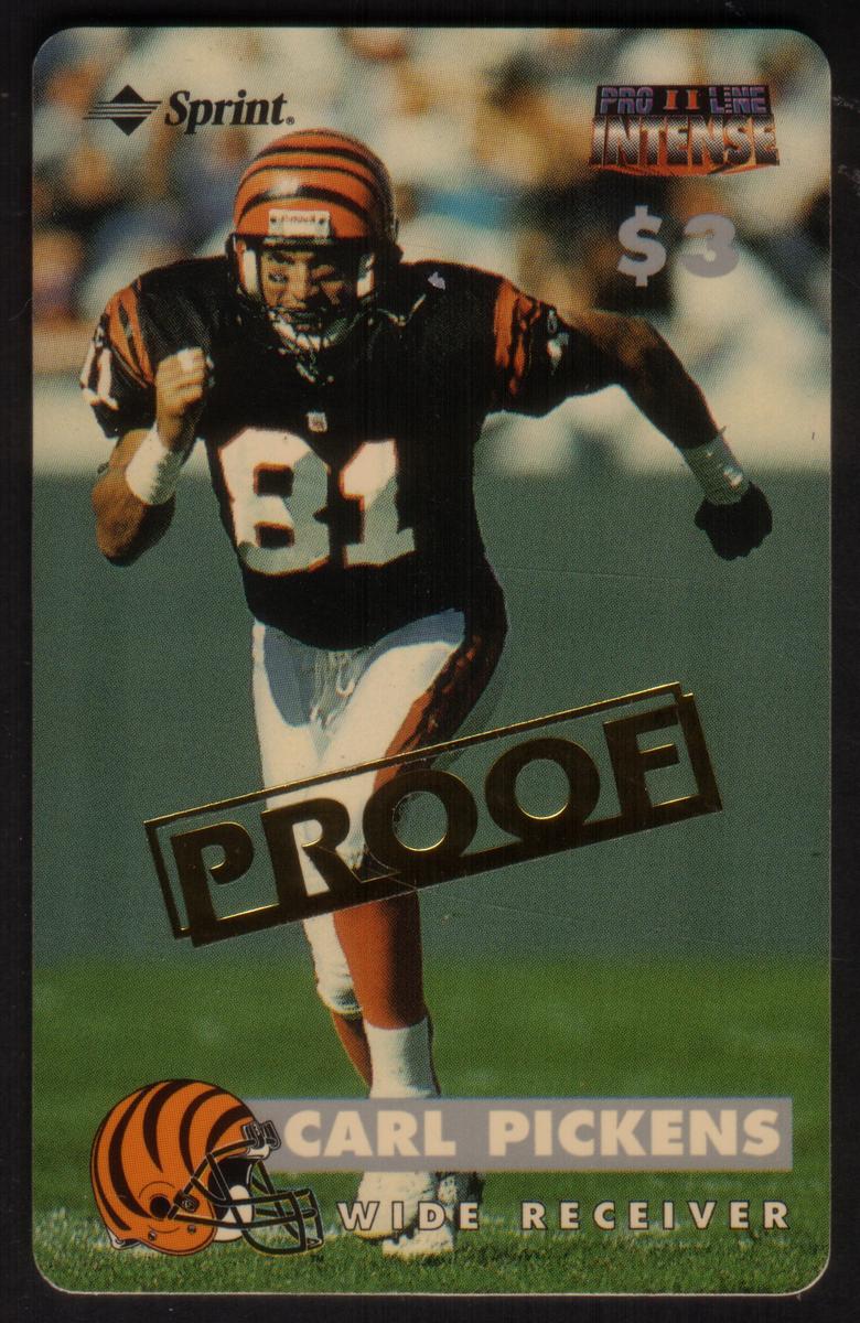 The card design includes the NFL logo and prominently displays Carl Pickens’ name. The photographic image captures Pickens in action or a posed athletic stance related to football. The card’s layout emphasizes the player’s identity and team affiliation within the NFL, reflecting its status as a sports collectible.