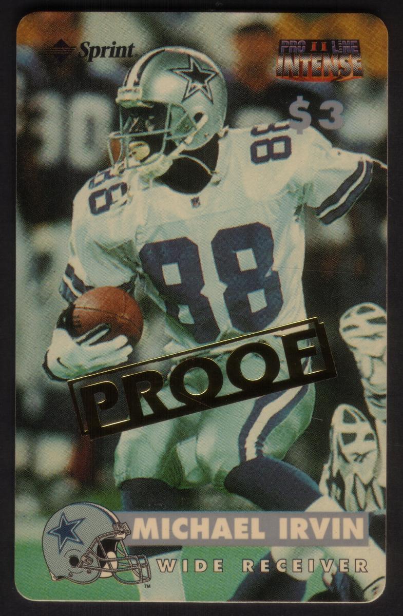 The card has a $3 value printed in the top right corner, and the word "Sprint" appears near the top left, identifying the phone card’s service provider. The design features the "Proline Intense" logo in the top right corner, indicating it is part of the 1997 Proline Intense series. Across the middle of the card, the word "PROOF" is stamped in bold, gold foil letters. Near the bottom, the player's name, "Michael Irvin," is displayed in large beige and white letters above a small Dallas Cowboys helmet graphic. Below his name is his position, "Wide Receiver," in smaller white text.