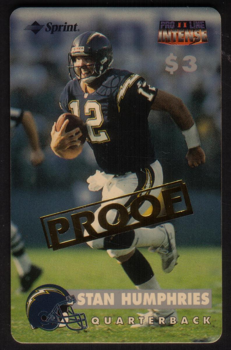 The card includes the logos of Sprint in the top left corner and "PROLINE INTENSE" in the top right corner, with a value of $3 indicated near the upper right area. Across the image center, the word "PROOF" is printed in large gold letters. Near the bottom, "STAN HUMPHRIES" is printed in bold white and pink capital letters, with "QUARTERBACK" printed beneath in smaller white letters.