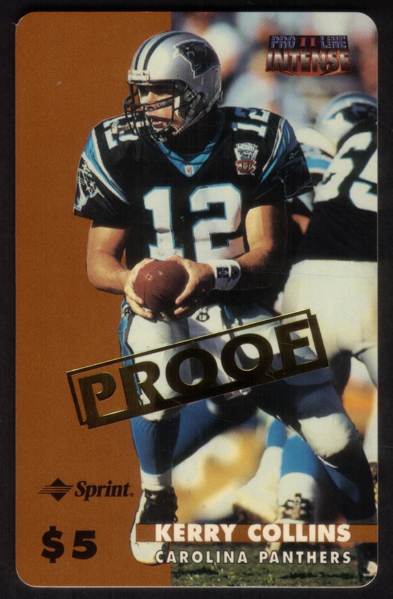 This collectible Proline Intense 1997 card features NFL quarterback Kerry Collins. The card prominently displays a photograph of Collins in full football gear, wearing a white jersey and a helmet without any visible numbers on it. He is pictured in action, holding a football with both hands as he prepares to pass. The background is a dark, solid color that highlights Collins in the foreground.