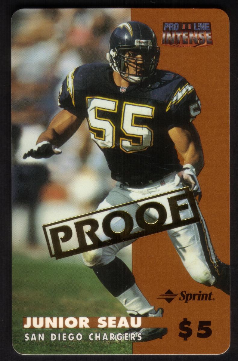 Overall, the card showcases Junior Seau in action attire within a dynamic design layout, highlighting its status as a collectible sports item focused on an iconic National Football League player.