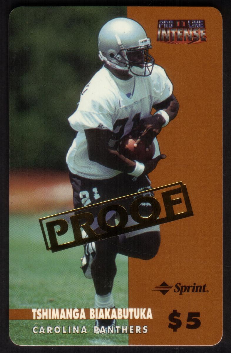 The front of the card showcases Tshimanga Biakabutuka in football gear, emphasizing his role as an NFL player. The design includes the NFL logo and clear markings indicating the football theme. The Proline Intense 1997 branding is visible, connecting the card directly to that particular collection and year of release. The layout is structured to highlight Biakabutuka, including his name and the $5 value prominently, reinforcing its collectible status.