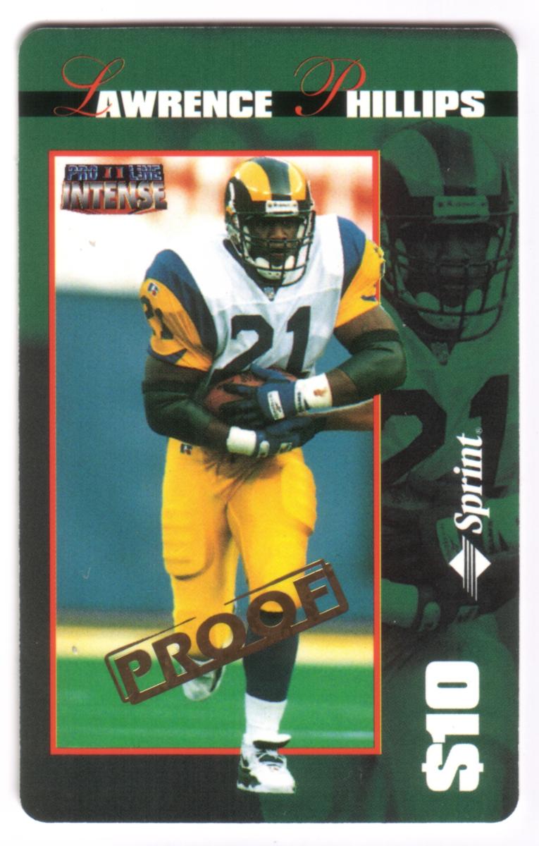 This collectible card features NFL football player Lawrence Phillips in action, wearing a white jersey with the number 21 and yellow pants. He appears to be running with the ball during a game. The card is titled "Proline Intense 1997" and is labeled as a *PROOF* version, printed by The Score Board Inc. The image is framed in red and set against a dark background with a large, shadowed image of Phillips wearing his helmet. The name "Lawrence Phillips" is displayed prominently at the top of the card in white and red text.