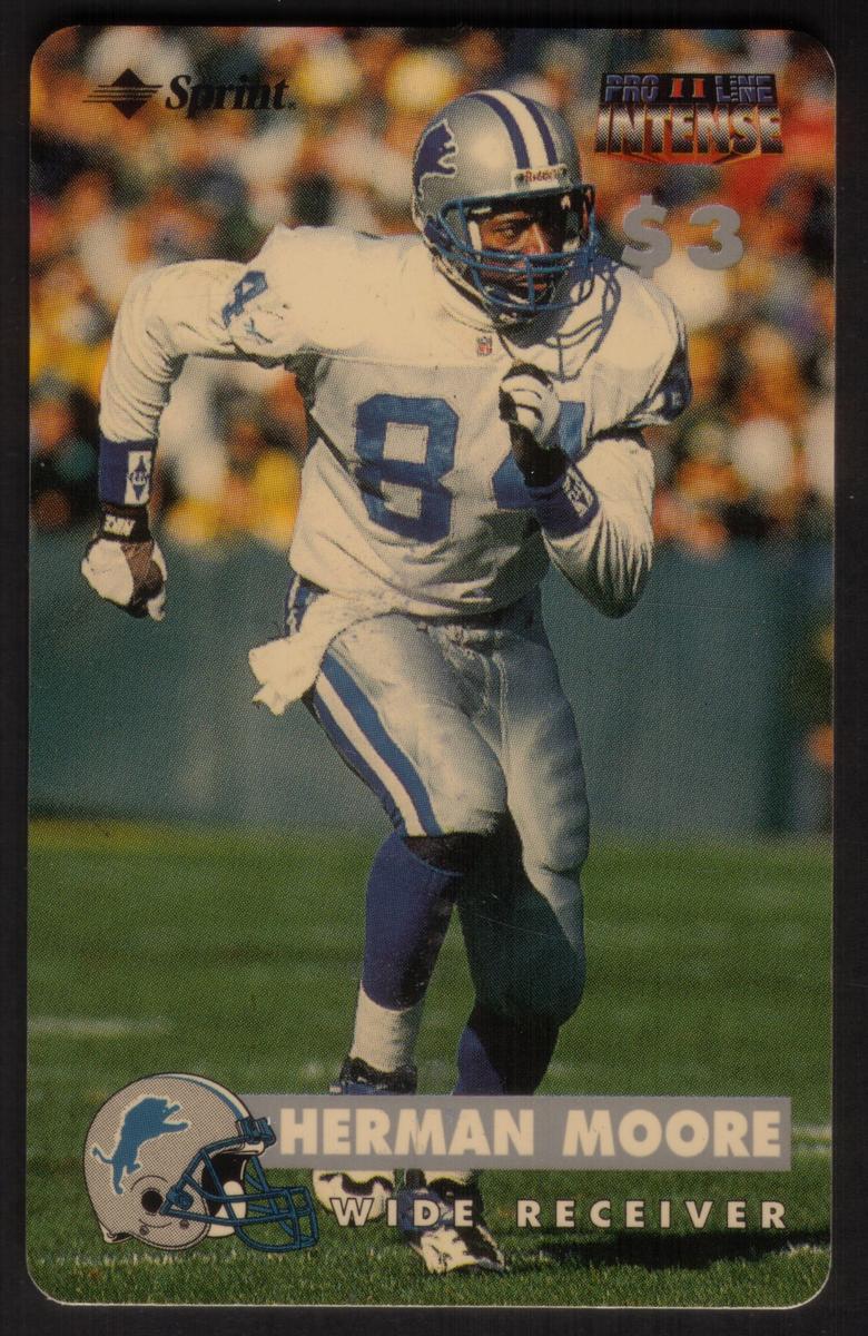 The card prominently includes the NFL logo along with branding from The Score Board Inc. The design highlights Herman Moore’s image in action, capturing the essence of the sport of American football. Text on the card clearly identifies his name and position as "Wide Receiver," linking him directly to his career in the NFL.