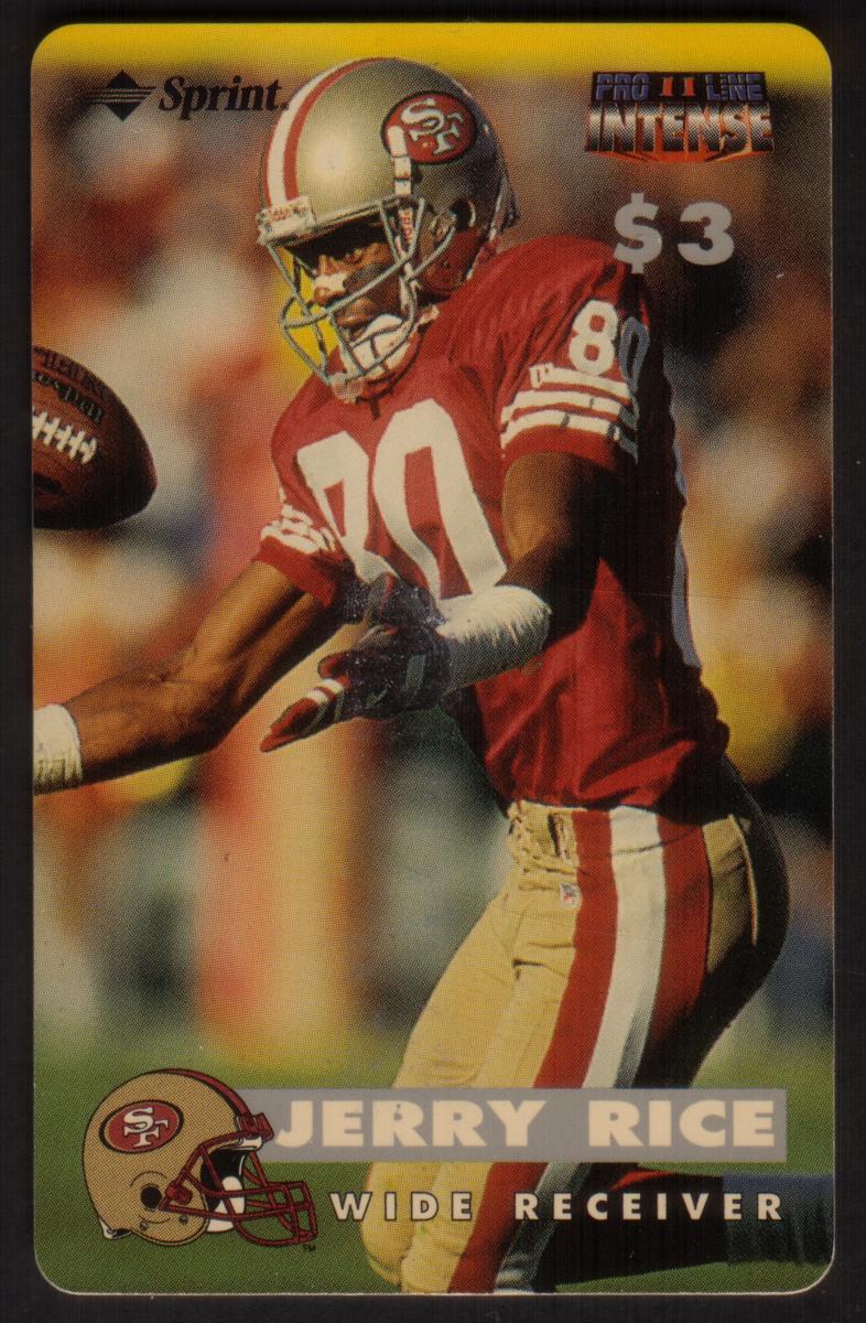 This collectible phone card features a photographic image of Jerry Rice, wide receiver for the San Francisco 49ers, in full football gear. He is wearing a red jersey with the number 80, gold pants with a white stripe, and a gold helmet with the 49ers logo. The photograph captures Jerry Rice in action, appearing to reach out toward a football.