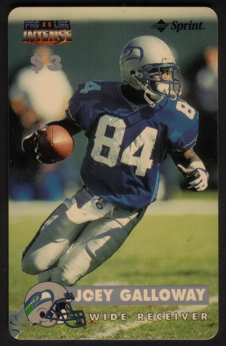 This collectible features Joey Galloway, a wide receiver in the National Football League (NFL), prominently displayed on a football-themed card issued by The Score Board Inc. The card is from the 1997 Proline Intense series and is numbered 19 out of a set of 50 cards. Joey Galloway is depicted in his football uniform, ready for action, highlighting his role as a player in professional American football.