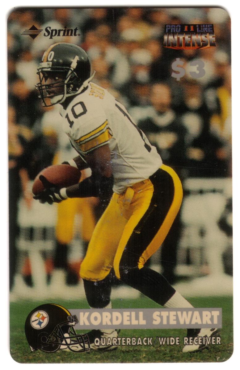 This collectible card features Kordell Stewart, a National Football League quarterback and wide receiver, depicted in full football gear. He wears a silver helmet with a face mask and a prominent Pittsburgh Steelers logo visible on the side. Stewart’s jersey is black with gold and white accents, matching the Steelers’ team colors. The image shows him in an action pose holding a football in his right hand, preparing to throw. His number 10 is clearly shown on the front of his jersey.