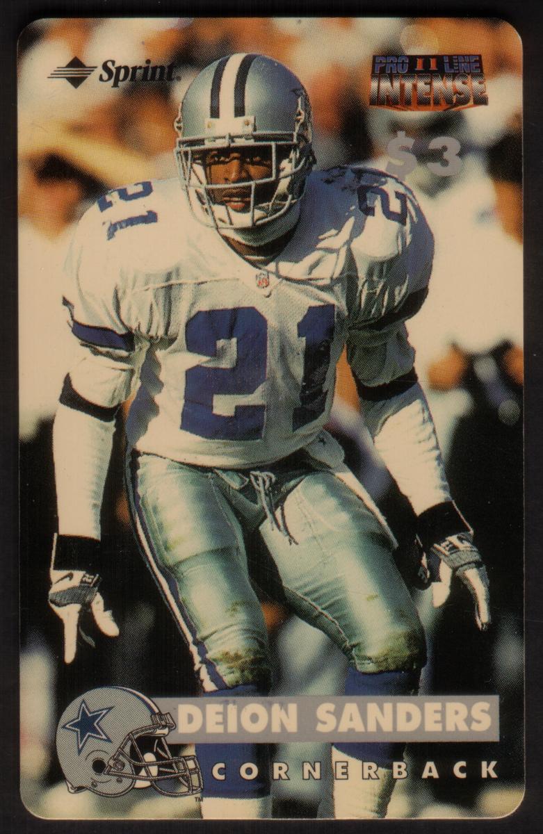 The card prominently displays official NFL and Proline Intense logos, authenticating its connection to professional football and sports memorabilia. The overall design incorporates a combination of photographic and graphic elements focused exclusively on Deion Sanders as the subject. The text on the card clearly identifies him by name and playing position.