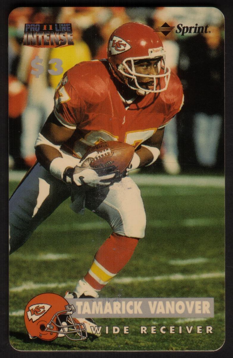 Additional football-related graphics contribute to the card’s design, such as a football icon and NFL branding that reinforce the card’s sports theme and official licensing. The overall presentation highlights Tamarick Vanover and his role as a prominent NFL player during the 1997 season.