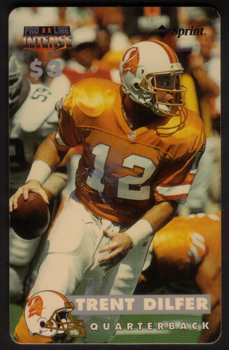 The card includes official NFL branding and The Score Board Inc. logo, associating it directly with recognized football collectibles. The background is simple and allows focus on Trent Dilfer’s figure, emphasizing the athletic theme of the card. The card is designed specifically to appeal to football fans and collectors of NFL memorabilia.