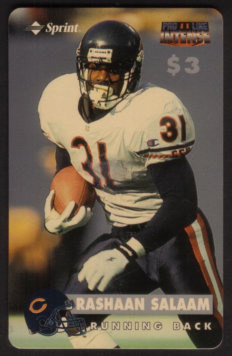 This collectible card features Rashaan Salaam, a professional football player who played as a running back in the National Football League (NFL). The card is from The Score Board Inc.’s 1997 Pro Line Intense series and is numbered 38 out of a limited edition of 50. The image shows Rashaan Salaam in his football uniform during action, emphasizing his athletic posture and focus.
