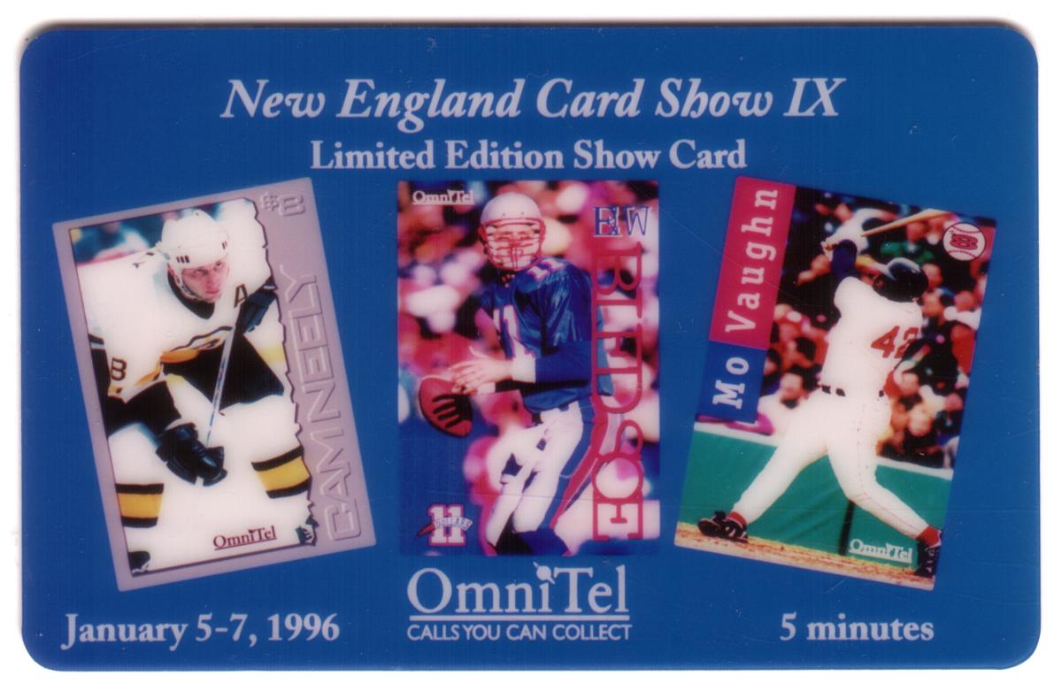 This collectible card features three prominent athletes from American professional sports: Cam Neely, Drew Bledsoe, and Mo Vaughn. The card is titled "01/96 New England Show Card IX" and is issued by OmniTel. The sports highlighted on the card include hockey, football, and baseball, corresponding to the three athletes depicted.