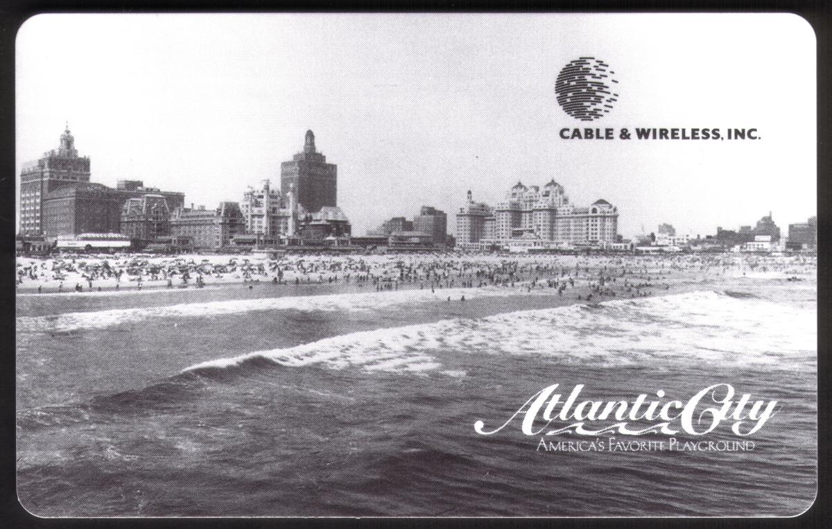 The second card presents a black and white historic view of the Atlantic City boardwalk filled with people along the beach and shoreline. The image captures architectural details of Atlantic City's landmark buildings from a past era, emphasizing the seaside city’s long-standing appeal as a tourist destination. This card also features the same "Atlantic City America's Favorite Playground" wording in white script at the bottom right corner and carries the Cable & Wireless, Inc. logo at the top right.