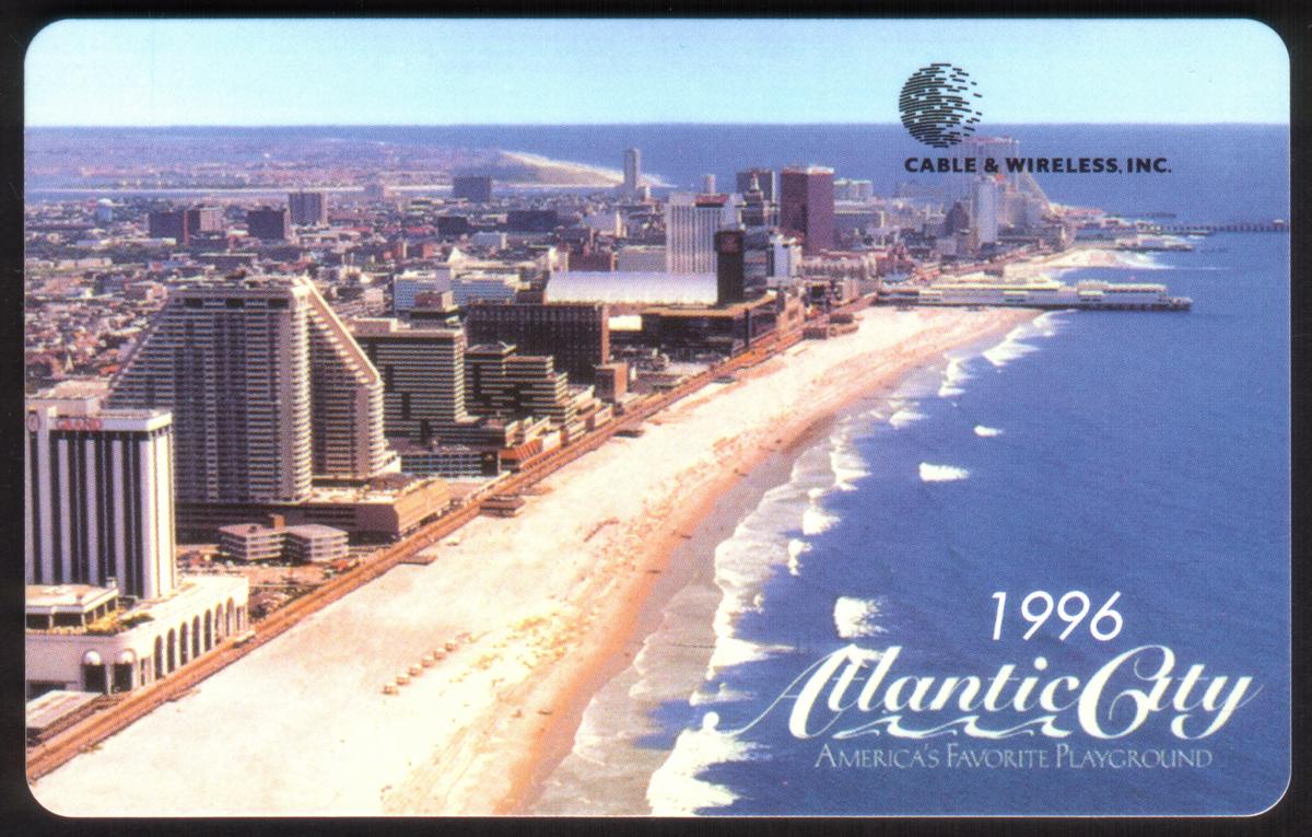 Both cards are part of a 1996 promotional set issued by Cable & Wireless, celebrating Atlantic City’s beaches and travel attractions under the 1996 Atlantic City Convention & Visitors Authority. They combine modern and historic imagery to create a collectible tribute to Atlantic City’s well-known sightseeing and recreational appeal.