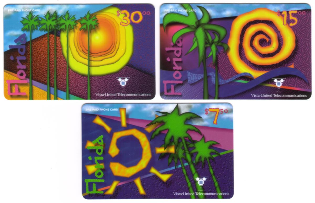 This set of three collectible phone cards titled "Florida Palm Trees & Sun" was issued by Vista-United Telecommunications in 1996. Each card features a vibrant and artistic design showcasing stylized palm trees against colorful and abstract Florida-inspired backgrounds. The $30.00 card displays three palm trees in front of a bright, concentric sunburst pattern with shades of yellow, orange, and red. The design's purple and green tones complement the sunny theme and evoke a tropical Florida atmosphere.