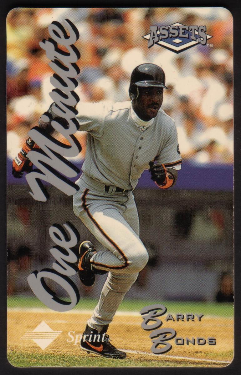 The card is part of the 1 Minute Assets Series #2 issued in 1995 by The Score Board Inc. The top left corner includes the text "BARREY BONDS (03/31/96)," indicating a date associated with the card. Along the top edge, printed text reads "Sports: Baseball, MLB, Major League Baseball, baseball players, baseball bats, baseballs," underlining the card’s connection to professional baseball and the sport’s key elements.