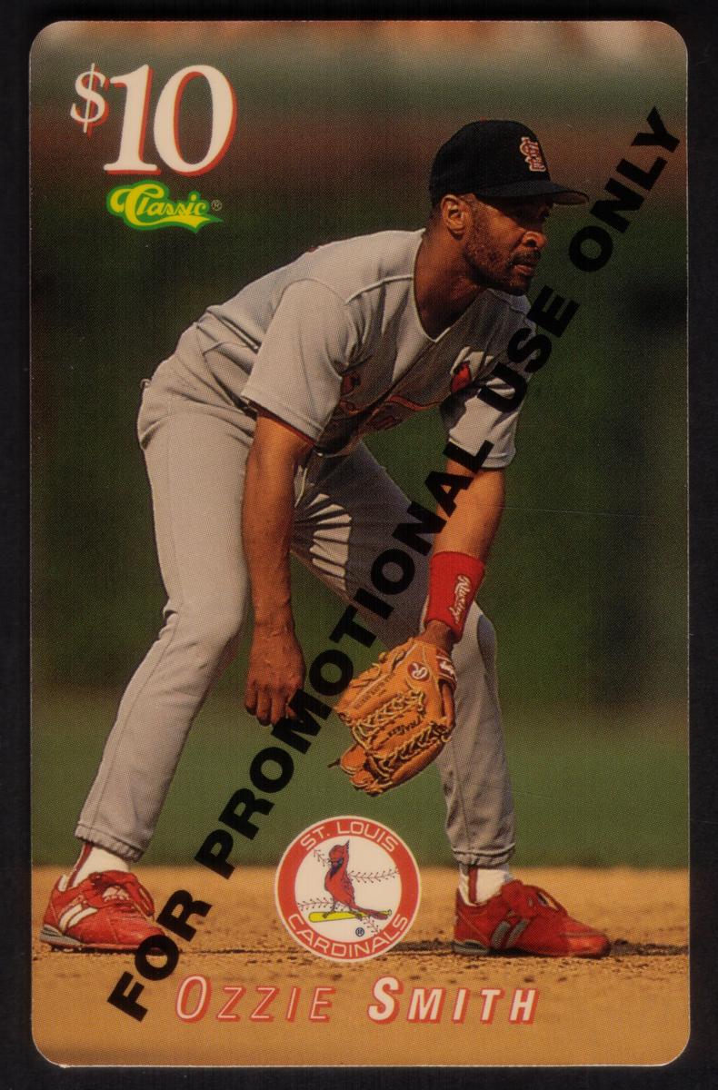 The card prominently displays the St. Louis Cardinals team logo and branding, associating it directly with the famous MLB team that Ozzie Smith played for. The design incorporates the official MLB logo, underscoring its licensed status. It is marked for promotional use only and has a value indication of ten dollars ($10.), consistent with collectible or special edition cards from that era.