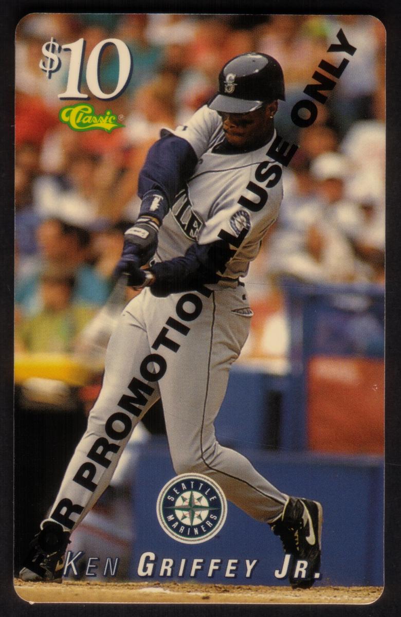 This item is a collectible phone card linked to MLB and Ken Griffey, Jr. It is not a bankcard, Visa Cash Card, or a piece of phone card supplies. The card serves as a promotional collector’s piece highlighting the achievements and recognition of Ken Griffey, Jr. in the sport of baseball.