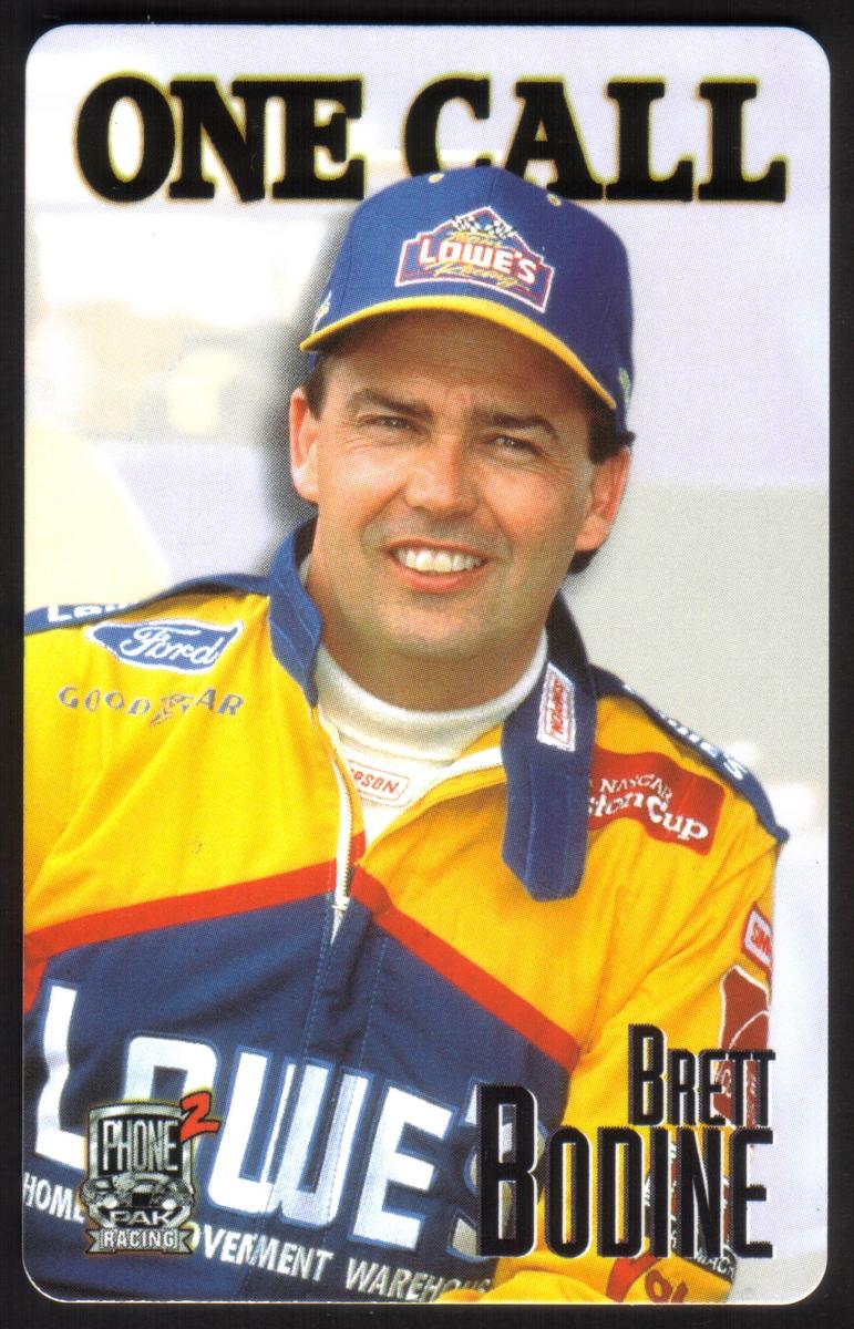 Additional cards feature Brett Bodine in a yellow, blue, and red Lowe's racing suit and cap, Geoff Bodine wearing a black QVC suit with sunglasses and a black cap, John Andretti sporting an outer jacket and mirrored sunglasses, Ken Schrader dressed in a red, white, and green Bud King of Beers suit, Bobby Hamilton in red, white, and blue STP Pontiac colors, Derrick Cope in a blue Badcock home furnishing racing suit, Ward Burton dressed in a black Menard Motorsports outfit with sunglasses, Joe Nemechek in a colorful black, yellow, and red Burger King racing suit, and Kenny Wallace in a blue TMC Squaresville racing suit and sunglasses.