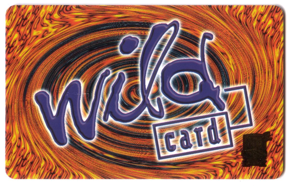 This collectible PhonePak 2 phone card from 1997 features a vibrant, swirling orange and black background reminiscent of flames or intense heat waves. Positioned prominently across the center is the stylized word "wild" in large, purple lowercase letters with a subtle white outline for emphasis. Below and slightly overlapping the letters "d" and "i" in "wild," a white rectangular stamp-like box contains the word "card" in lowercase, dark purple letters. The design presents a dynamic, fiery aesthetic matched with bold typography.