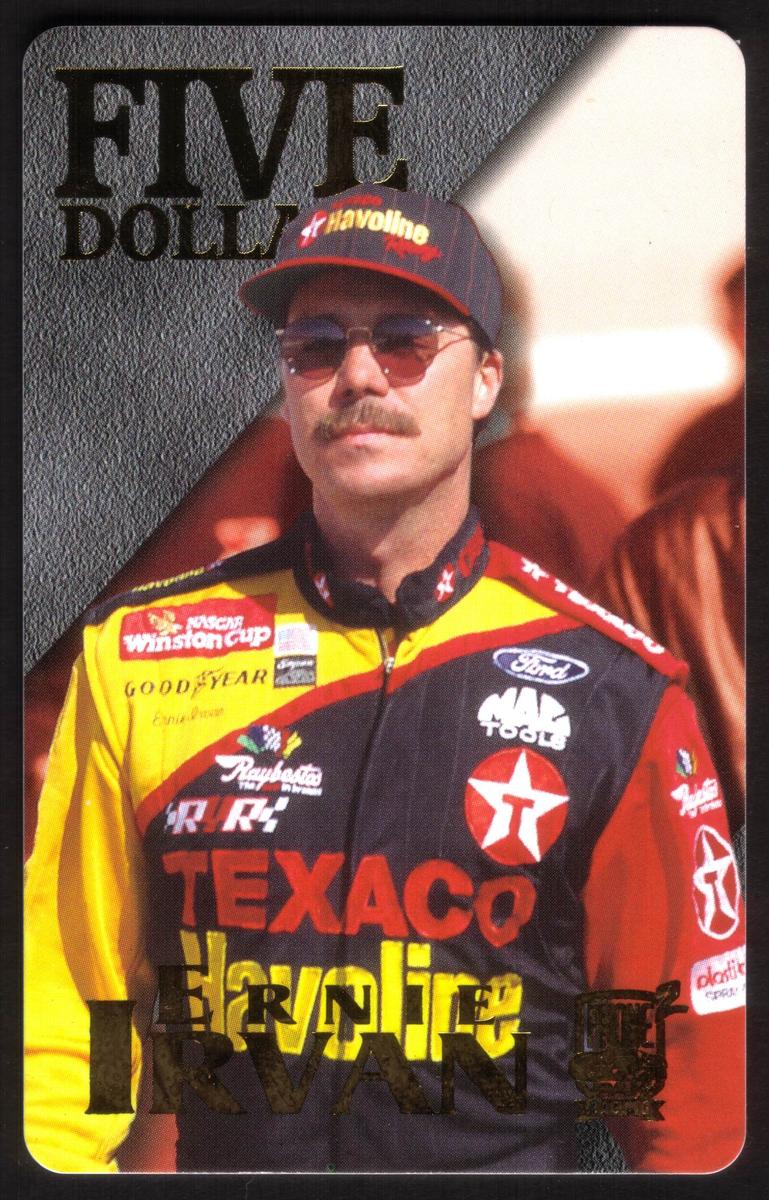 Irvan is sporting sunglasses and a mustache, and his cap bears the Havoline logo in yellow and red. The racing suit colors are predominantly yellow, red, and black, with distinctive branding that reflects the corporate sponsorship of his racing team. The card includes a finish line graphic with the name "Irvan" displayed in black text at the bottom, emphasizing the racing theme.