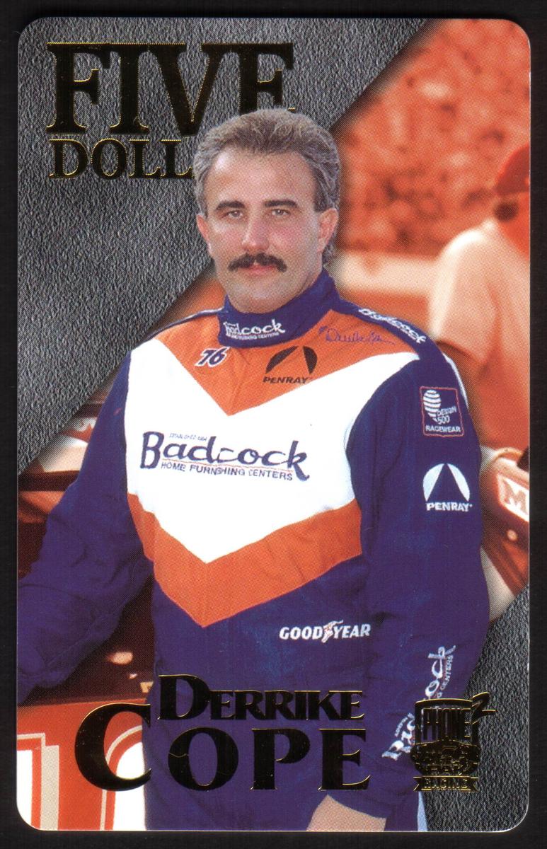 This collectible phone card features imagery related to auto racing and NASCAR. It prominently displays the name Derrike Cope, a professional race car driver, along with corporate logos and brand names associated with Badcock and Penray. The card includes a detailed depiction of a racing helmet and a race car, which correspond to Derrike Cope’s affiliation with these sponsors and the sport.