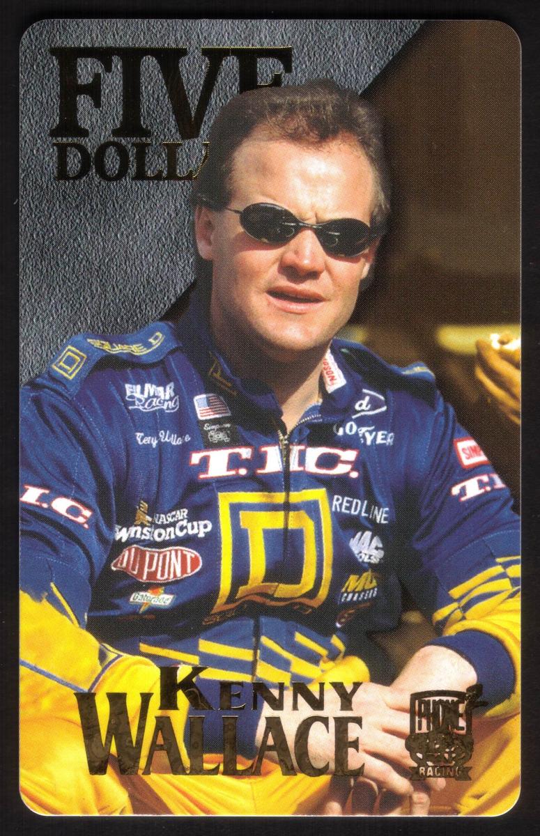 This collectible phone card features a vivid image centered on auto racing, specifically highlighting NASCAR. The main visual element is a red race car with prominent corporate branding for Dupont and Gatorade displayed on its hood and side panels. The car appears in motion, emphasizing speed and excitement associated with NASCAR events. The card also includes text with the name Kenny Wallace, a well-known NASCAR driver, clearly linking the card to his racing career.