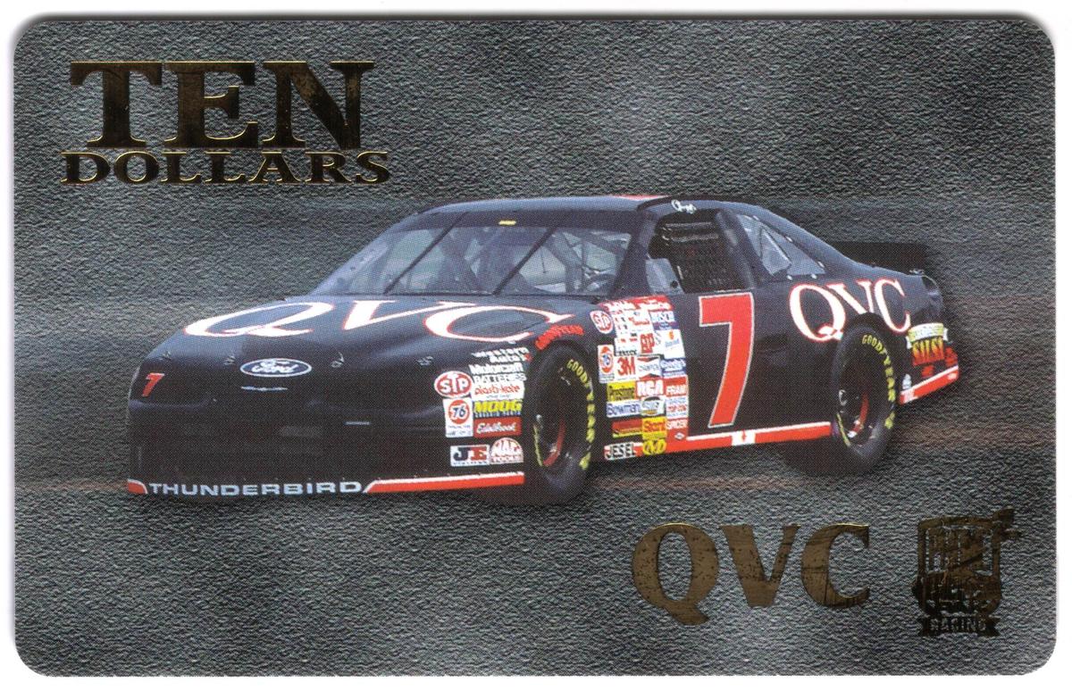 The card has a textured grey background. The top left corner shows the denomination "TEN DOLLARS" in large gold foil letters, while the lower right corner displays the "QVC" logo in matching gold foil. A small emblem for Finish Line Racing appears in the bottom right area near the QVC text.