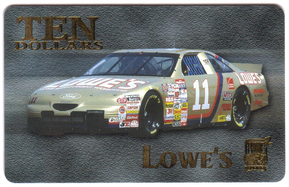 This collectible phone card features a detailed image of the Lowe's Car #11 from NASCAR auto racing. The car is a stock car sponsored by Lowe's Home Improvement Warehouse, prominently displaying the Lowe's logo on the hood and sides. The car is Ford-branded and showcases various corporate sponsorship decals, including Busch Beer and others common in professional auto racing. The number "11" is clearly visible on the door panel.