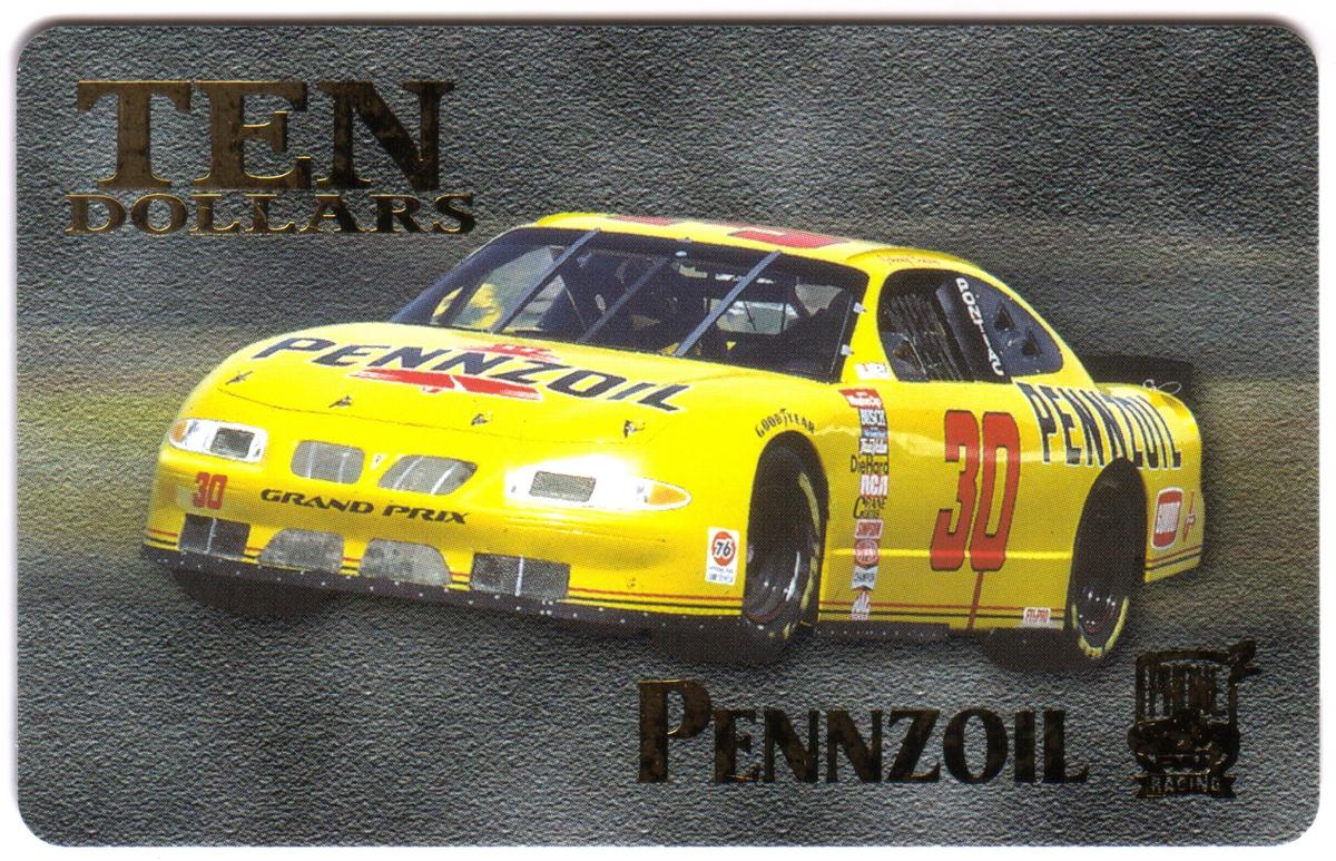 This collectible phone card features an auto racing theme centered on NASCAR. The card prominently displays an image of the Pennzoil-sponsored race car number 30, driven by Johnny Benson. The race car is illustrated with dynamic red, yellow, and black colors, showcasing the Pennzoil corporate logo clearly on the hood and sides. The artwork captures the speed and excitement associated with NASCAR racing, emphasizing automotive branding and sponsorship common in the sport.