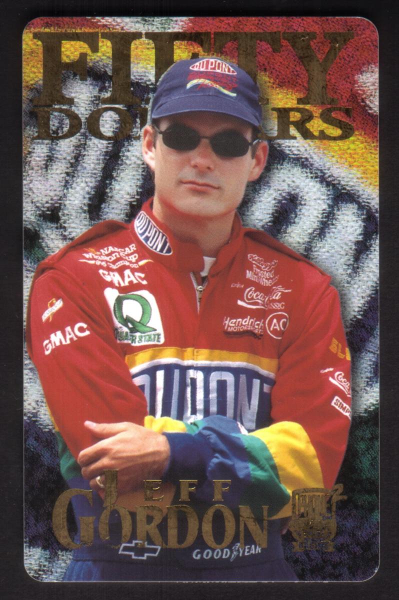 This phone card celebrates Jeff Gordon’s prominence in auto racing and features corporate trademarks and logos related to his racing career and sponsors, making it a valuable collectible for NASCAR fans and phone card collectors.