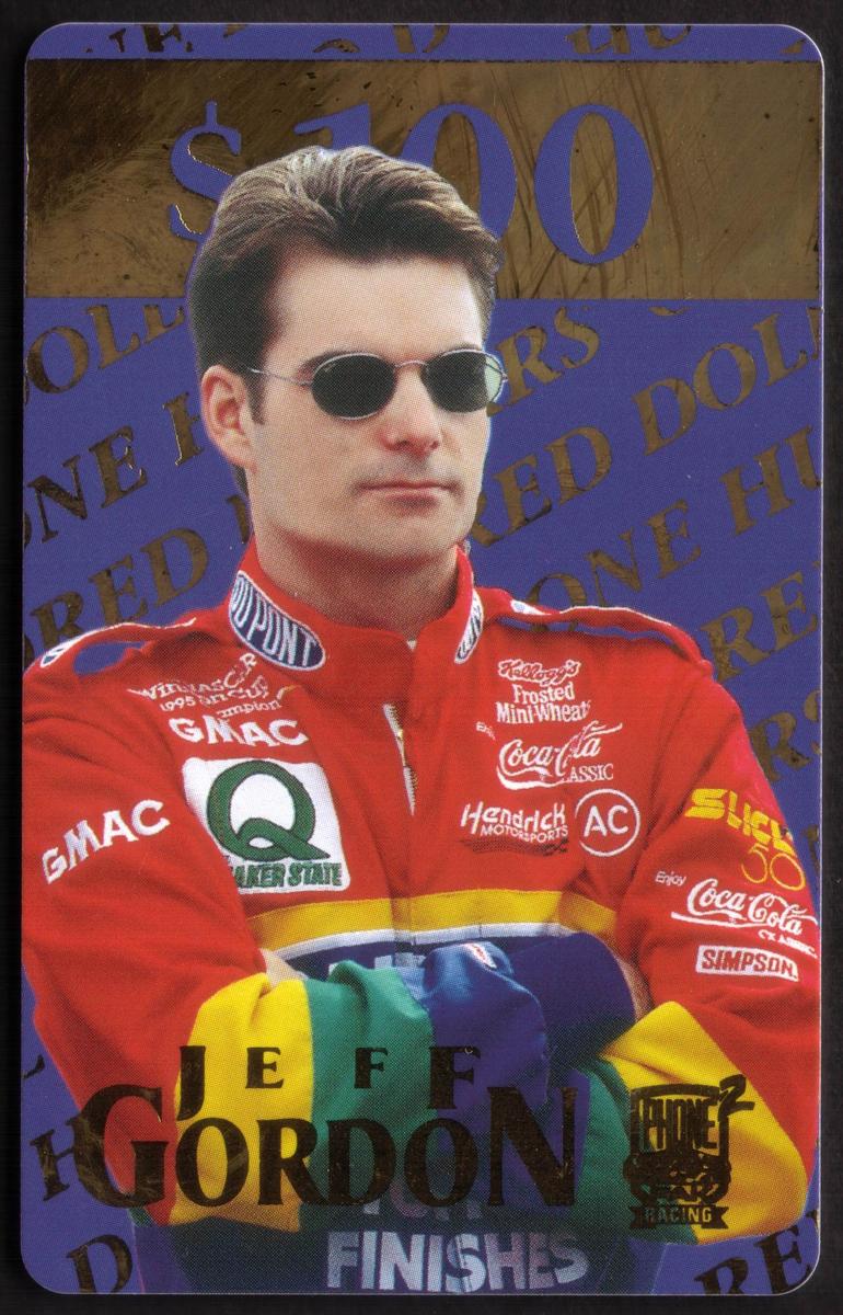 Jeff Gordon NASCAR-themed phone card featuring a vibrant racing jacket, sponsor logos, dark background, and a $100 denomination, combining memorabilia with utility. |