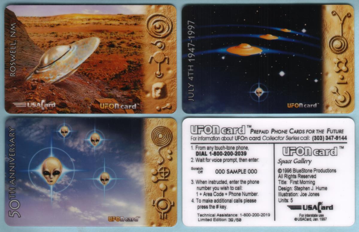 No personal names are visible on the card. The card itself clearly aligns with themes of aliens, flying saucers, and the Roswell UFO incident. It is a collectible phone card designed with strong graphical elements that appeal to enthusiasts of UFO history and artistic fantasy.