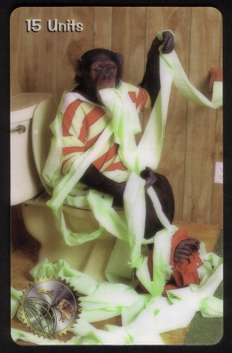 This collectible phone card features a playful scene of a monkey inside a bathroom. The monkey is interacting with white toilet paper that is unrolled and spread around. The background shows a standard bathroom setting, including a white toilet bowl and cream-colored tiled walls. The lighting is bright, illuminating the entire area clearly.