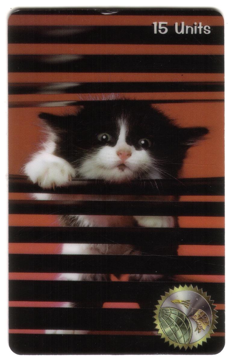 In the upper left corner of the card, the denomination "15u" is printed, indicating the card’s value. The text "Black & White Cat Peering Through Horizontal Blinds (Photo)" is present on the card, labeling the subject of the image. Additionally, the name "Destiny Telecomm" appears, identifying the issuing entity associated with the card.