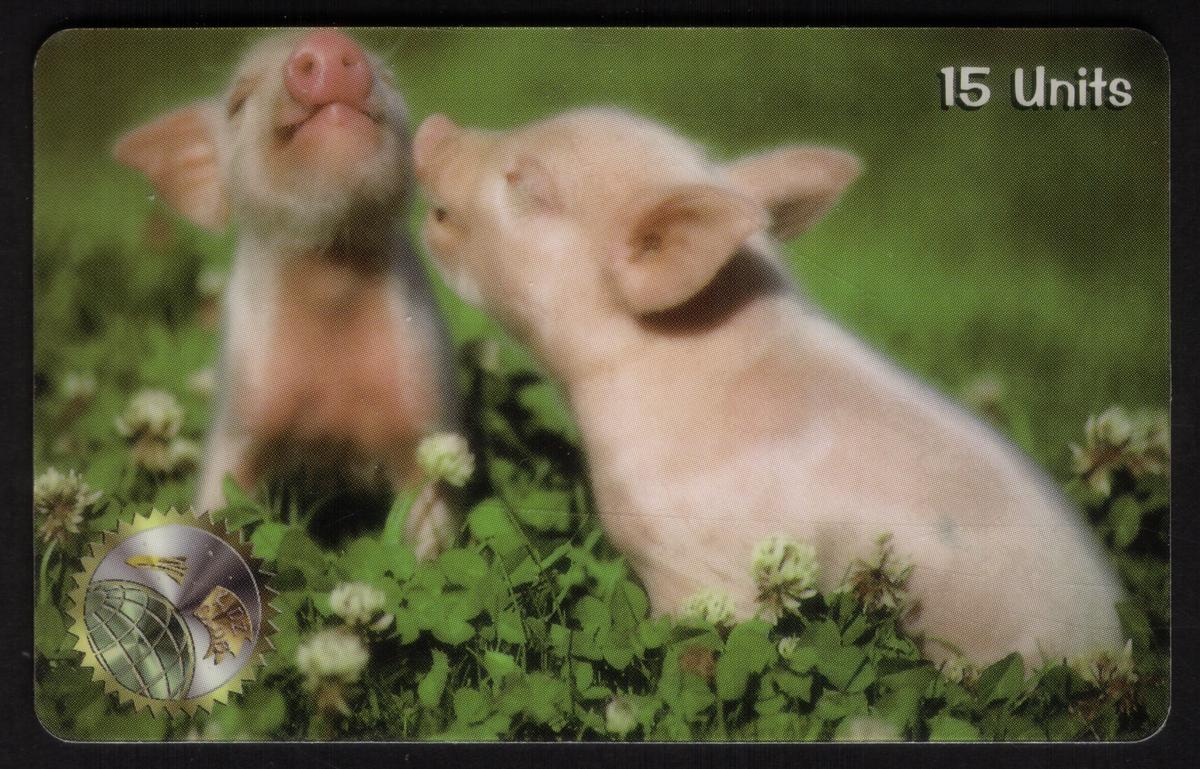 This collectible phone card features a photographic image of two baby pigs standing on green grass. The piglets have smooth, pink skin and are positioned close together, with one facing forward and the other slightly turned to the side. The background includes a blurred natural setting, emphasizing the farm animal theme.