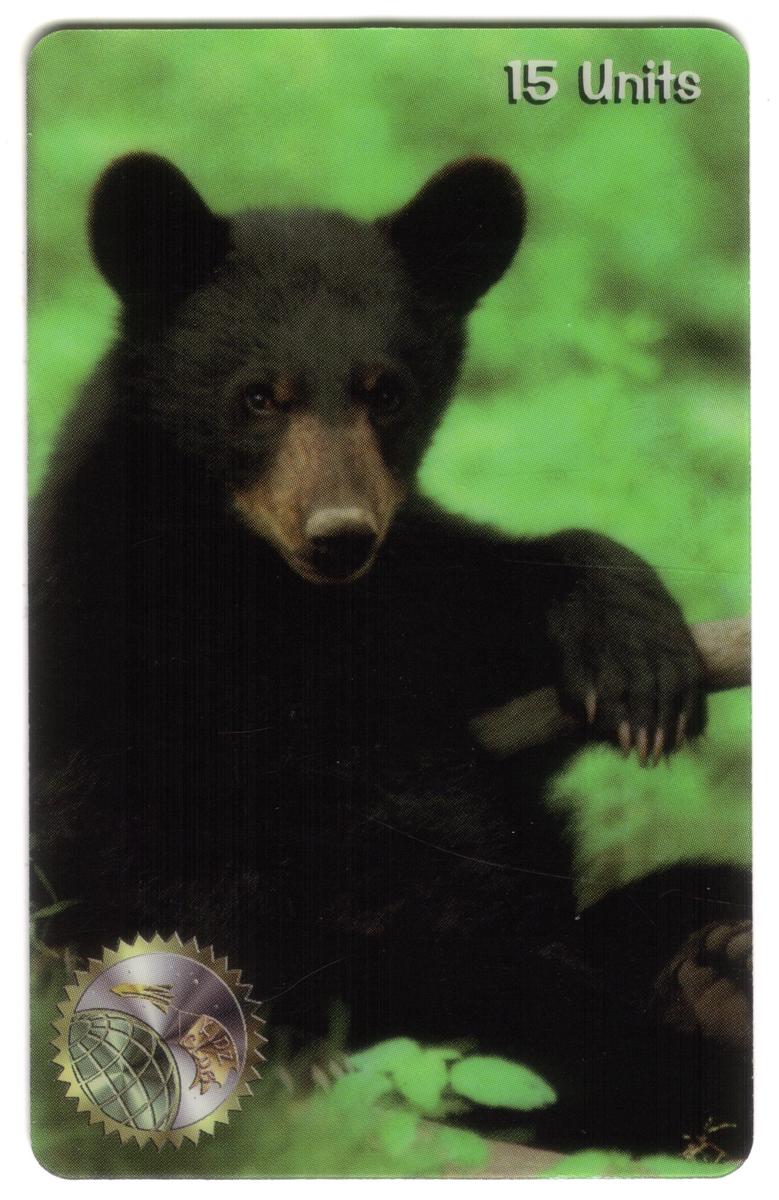 In the upper portion of the card, the text “Destiny Telecomm” is printed, indicating the telecommunications company associated with this phone card. The card’s value is marked as “15u,” which is displayed clearly at the top right corner. The lower left corner includes the designation “Black Bear (Photo),” reaffirming the focus of the image on the black bear. The overall design emphasizes wildlife, specifically highlighting black bears as part of an animals and wild animals theme.