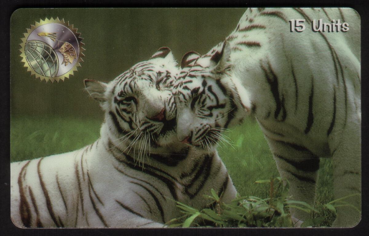 This collectible phone card features a photographic image of two white tigers cuddling closely together. The tigers are prominently displayed in the center of the card, showcasing their distinctive white fur with black stripes. Their powerful yet graceful forms are depicted with clear detail, highlighting their facial features and sleek bodies. The setting emphasizes the natural appearance of these wild animals, capturing a moment of calm interaction between the two cats.