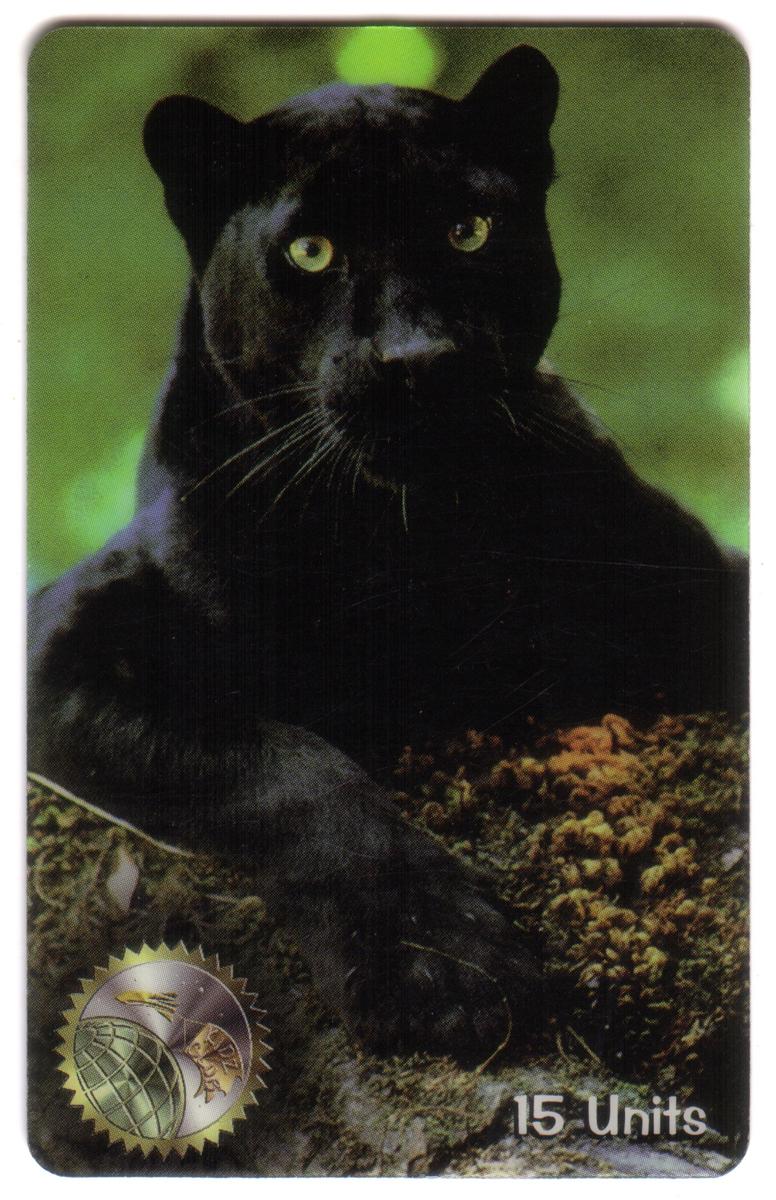 This collectible phone card features a striking photographic image of a black panther. The panther is depicted in close-up, with its golden-yellow eyes staring intensely directly at the viewer. The wild cat’s sleek black fur contrasts with the dark, shadowy background, highlighting its muscular form and fierce expression. The image captures the strength and mystique of this wild animal, emphasizing the panther’s role as a powerful predator.