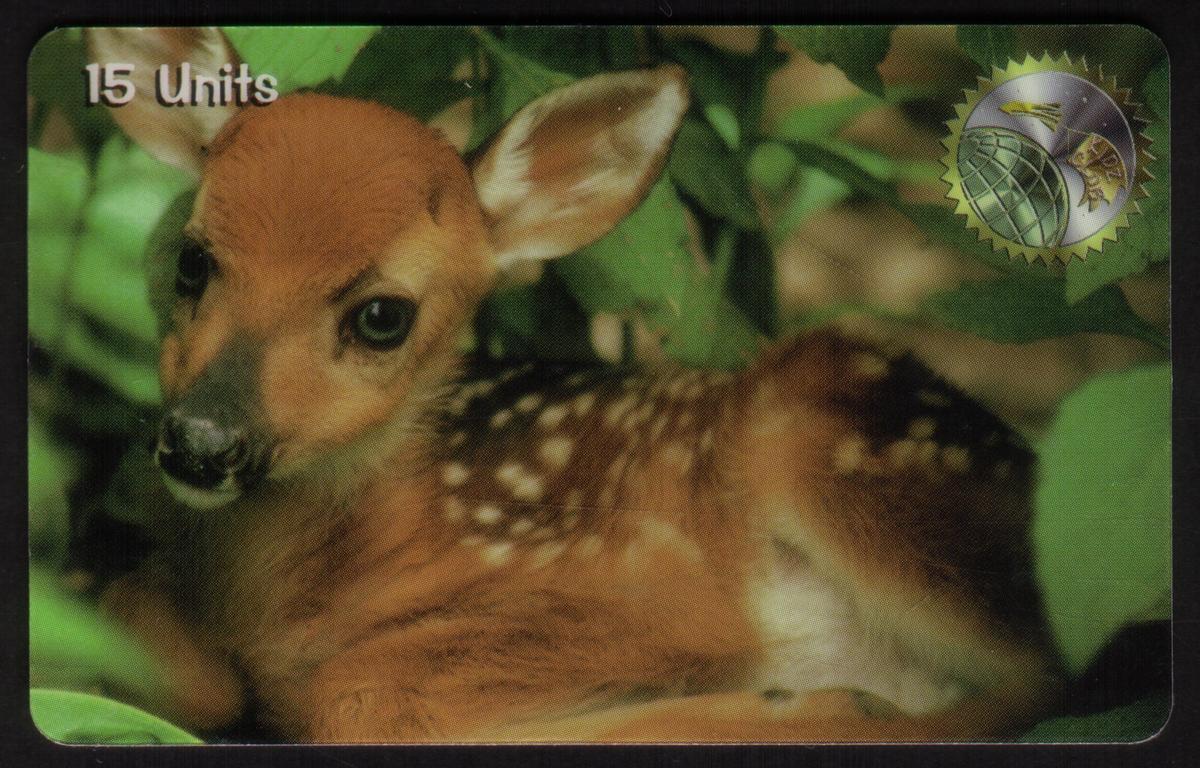 Overall, the card combines the elements of natural beauty with telecommunications, featuring both the functional aspect of the phone card and an appealing wildlife photograph. The design integrates the text, the denomination, and the image in a balanced way, offering collectors a vivid representation of young deer in a leafy environment.