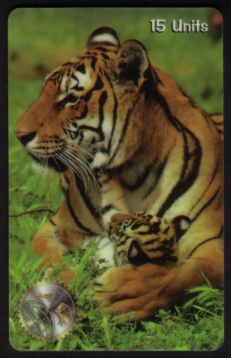 This phone card is part of a series dedicated to animals, specifically wild cats such as tigers, as referenced in the text and the visual content. The card combines a high-resolution wildlife photograph with identifying text, making it suitable for collectors interested in animal-themed phone cards and tiger imagery.