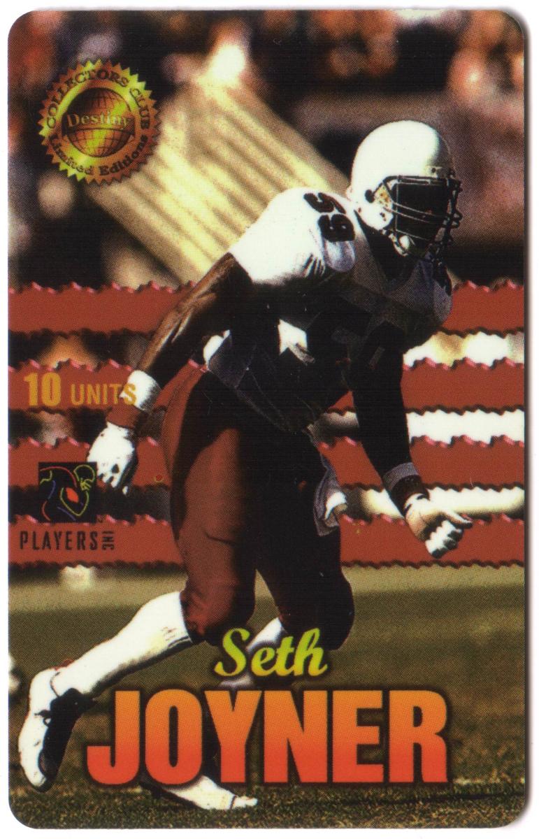 Additional graphics on the card include a stylized football icon on the left side and the NFL logo situated above Seth Joyner’s name. The overall color scheme combines red, black, and white, matching the Arizona Cardinals’ team colors. This card commemorates Seth Joyner’s contributions to football and is designed for collectors interested in NFL memorabilia.