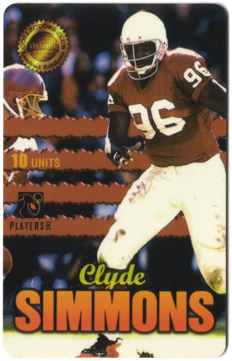 Additional graphic elements include stylized patterns and a partial shadow effect around the player’s image, enhancing the visual impact. The text layout is clean and bold, with emphasis on the player’s name and key identifiers. This card is a collectible sports-related item celebrating Clyde Simmons and his football career.
