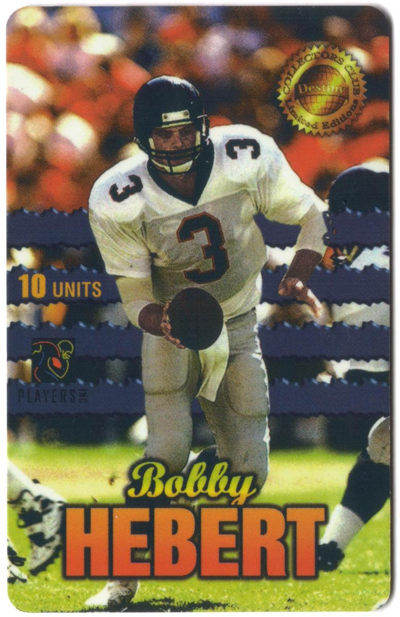 This card is a collectible related to football and NFL players, specifically recognized for its limited edition status numbering 5 out of 100. It celebrates Bobby Hebert’s legacy as a quarterback with clear branding linked to football and Destiny Telecomm.