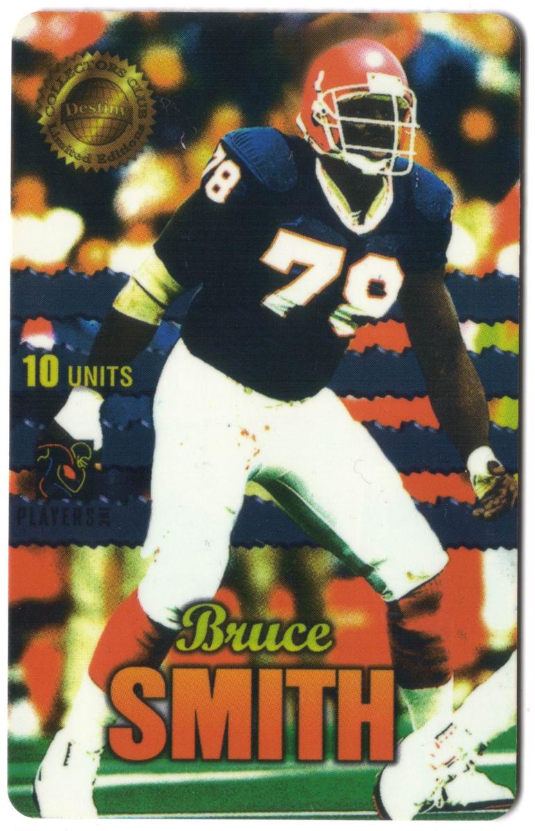 Overall, this is a limited edition collectible card centered on NFL football and Bruce Smith’s athletic career, rendered with bold text and football-related visuals to honor "Men of Destiny" in the sport.