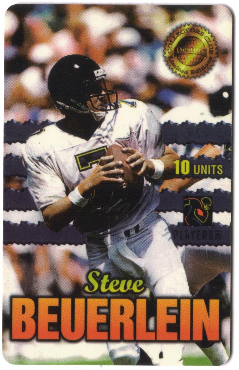 This collectible card features Steve Beuerlein, a quarterback for the Carolina Panthers in the National Football League (NFL). He is depicted in his team's uniform, wearing the Panthers’ distinctive silver helmet and teal jersey with black and white accents. The image highlights Beuerlein in an action pose, holding a football with both hands, preparing to throw. His focused expression reflects his role and intensity on the field.