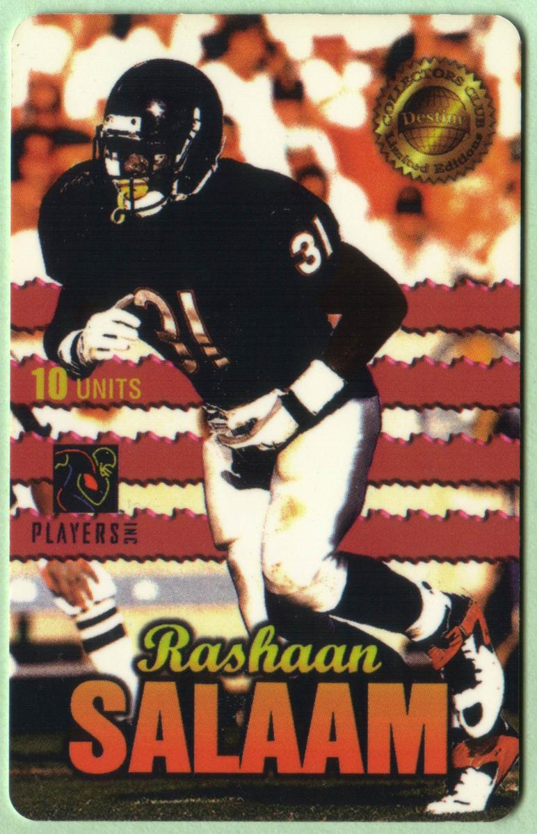 The overall look combines football imagery with collectible presentation, highlighting Rashaan Salaam’s place in NFL history as a running back for the Chicago Bears. The card’s usage and number sequence emphasize its status as a limited collectible item within a numbered series.