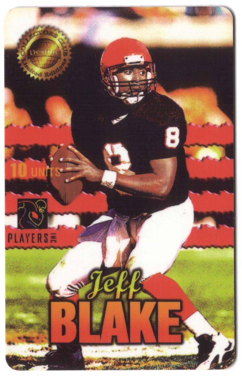 This piece is a used collectible, specifically related to football and the NFL, and captures a moment representing Jeff Blake’s professional sports career with Cincinnati. The card’s design integrates logos and text that confirm its official branding and limited-edition status, making it a notable item for football fans and collectors.